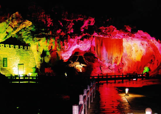 奇梁洞位于縣城北四公里處,屬典型的碳酸鹽巖洞,該洞以奇、秀、闊、幽四大特色著稱。洞長6000余米,共分五大景區(qū):即古戰(zhàn)場、畫廊、天堂、龍宮和陰陽河。洞中有山,奇梁洞圖片山中有洞,洞洞相連。它集奇巖巧石,流泉飛瀑于一洞,由千姿百態(tài)的石筍、石柱、石鐘乳構(gòu)成了一幅幅無比瑰麗的畫卷。一條小溪穿洞而過,水流平緩,燈光打在巖壁上,皺襞倒影在水中,如夢如幻。巖洞用五光十色的霓虹燈打在石筍、石幔及石花上,營造出一個(gè)流光溢彩的世界。在洞內(nèi)有一大廳,據(jù)傳是苗民糾集的地方,廳里立著一塊帶一個(gè)小孔的石頭,對(duì)著小孔“嗚嗚”地吹,整個(gè)大廳會(huì)回蕩著低沉的號(hào)角聲,當(dāng)年的苗民就是用這種方式傳令的。