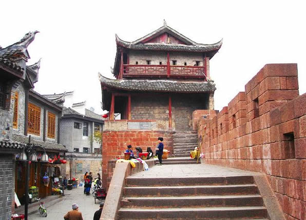 到清朝,古城的軍事地位日顯重要,先后在這里設(shè)鳳凰廳、鎮(zhèn)竿鎮(zhèn)辰沅永靖兵備道治所,古城的建設(shè)也得到加強(qiáng)。康熙五十四年(1715年)遂將磚城改建為石城,北門定名為“壁輝門”,一直保存至今。北門古城樓采用本地紅砂條石筑砌,做工考究,精鉆細(xì)琢。城門呈一半月拱,有兩扇鐵皮包裹。圓頭大鐵釘密鉚其上的大門。城樓用青磚砌筑,重檐歇山頂,穿斗式木結(jié)構(gòu),石座卷頂。城樓對外一面開槍眼兩層,每層4個,能控制防御城門外一百八十度平面的范圍。北門城樓與東門城樓之間城墻相連,前臨清澈的沱江,既有軍事防御作用,又有城市防洪功能,形成古城一道堅(jiān)固的屏障,雖幾經(jīng)戰(zhàn)火,仍巍峨聳立于沱江河岸。